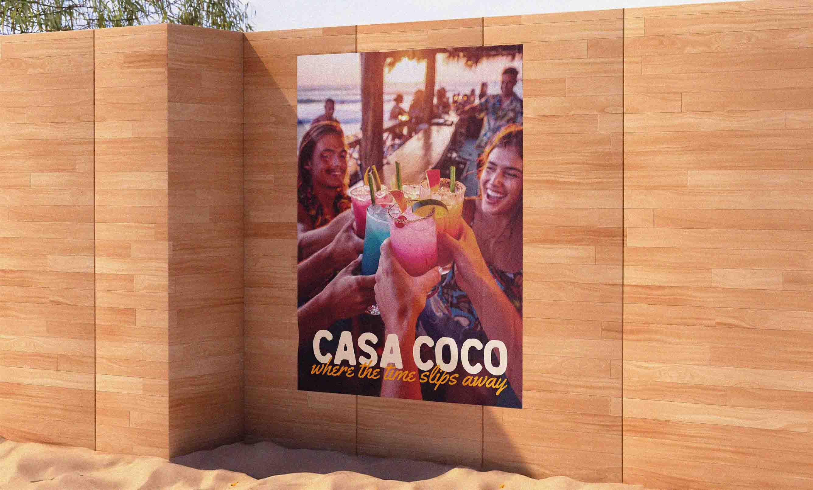 The goal of this project was to reflect the feeling of warm, laid-back summer evenings spent in good company through the brand identity. For the logotype, I chose a typeface with a rustic character and uneven edges that reminded me of the charm of a wooden beach bar stall. I paired it with a flowy, relaxed script as the secondary typeface, which felt like a handwritten note on a holiday postcard. To continue the theme of flow, I designed a custom pattern based on the wavy marks you see on the sea bottom. Finally, I created illustrations of drinks as little characters in sunglasses, highlighting that at Casa Coco, you’re always in good company.